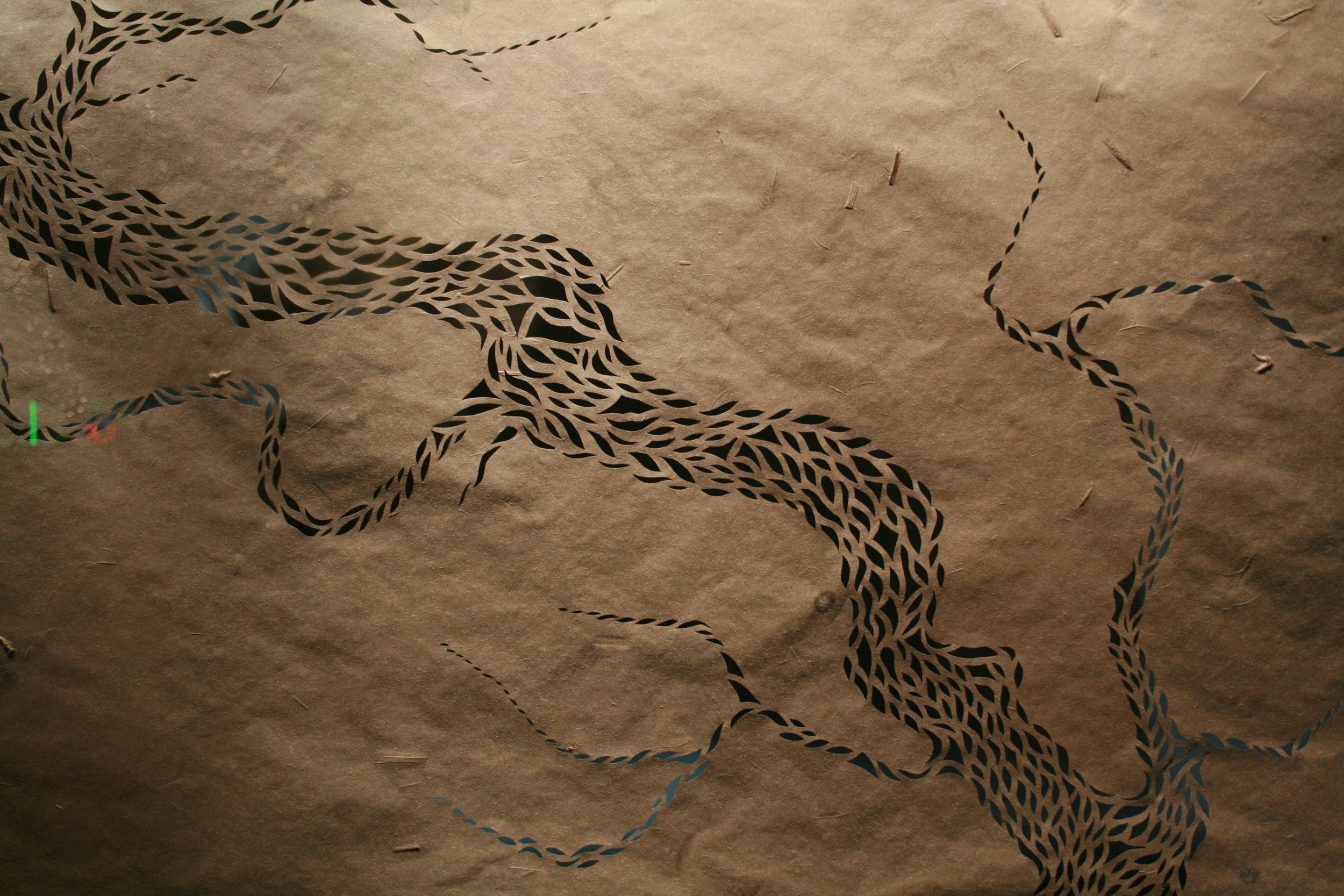 These panels embody the idea of the Upper, Middle, and Lower Napa River watersheds. Through papercutting, the human mark made upon the native fiber reflects the human presence in Napa River ecosystem.