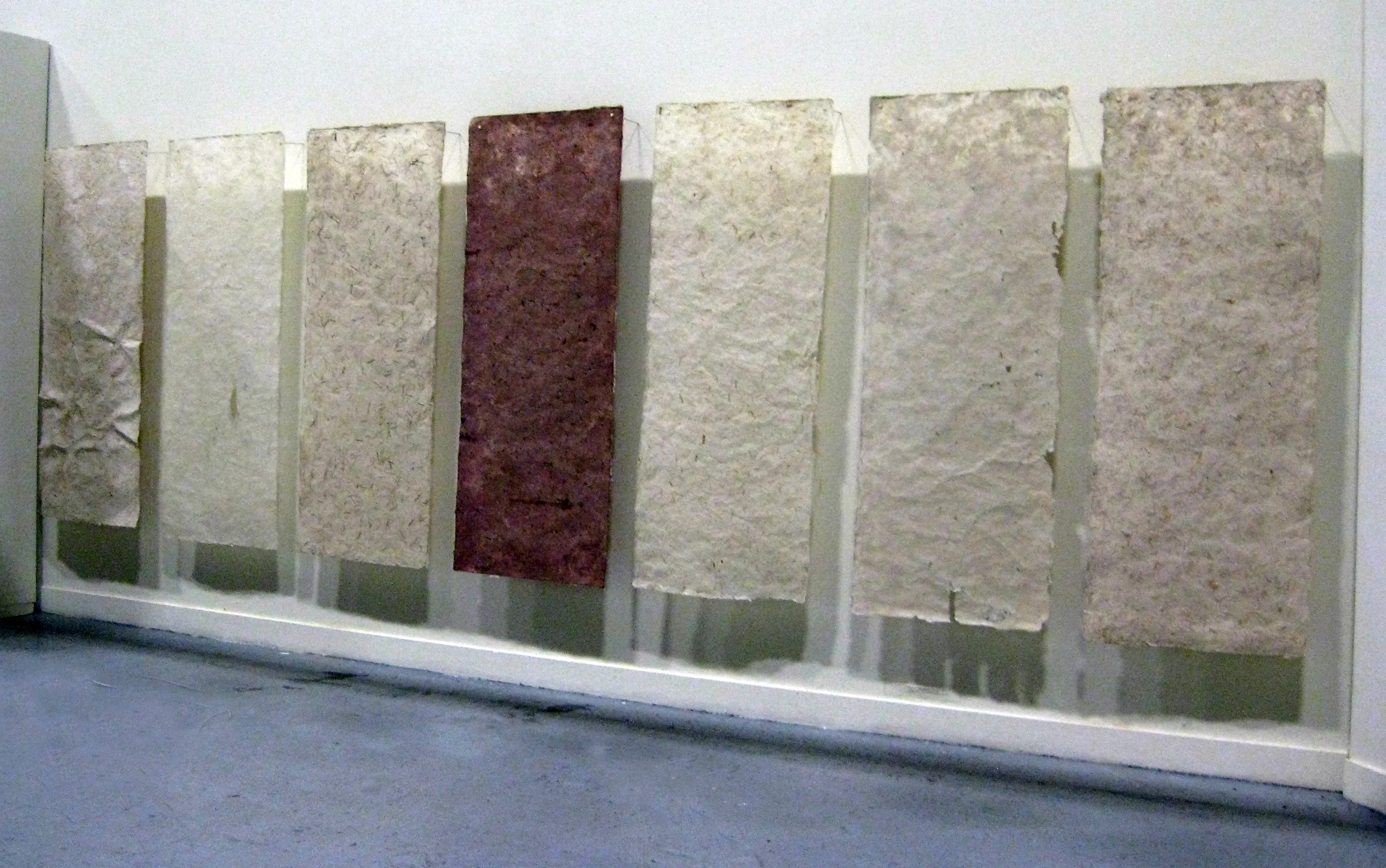 Handmade papers made from zuchini, sunchoke, fennel, corn, artichoke, mint, and iceplant. Each paper measures 7 ft x 30 inches; entire installation 9 ft x 21 ft.
